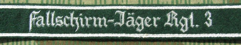 RSE160.Fallschirm-Jager Rgt 3 enlisted ranks cufftitle. Hand embroidered sSilver-Grey thread on Dark Green. $19.95 |