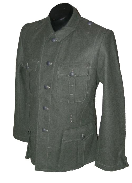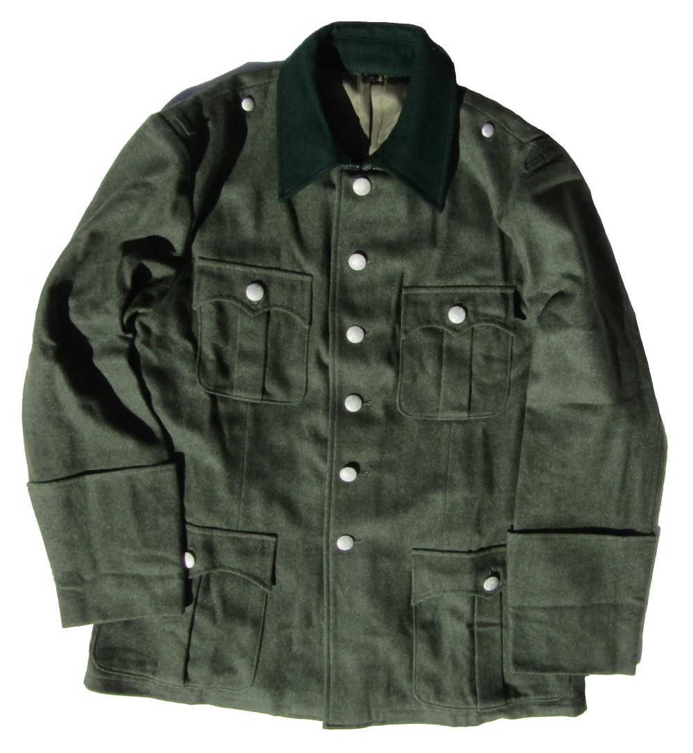 field gray wool M43 tunic. These tunics have all the details of the originals: 6-button front, hook and eye collar, belt hook holes, acetate lining, split cuffs, collar bind buttons, first aid dressing pouch, shoulder board loops, etc Available in sizes 40, 42 ,44 ,46 ,48 ,50. Comes with either SS or Army insignia, your choice. shoulder boards , collar tabs , sleeve or breast eagle. $139.95 |