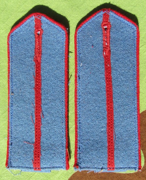 | ERR33.Reproduction Russian WW1 / WW2 Soviet junior officer style shoulder boards with red piping and red center stripe on Blue fabric. Slip on.$5.00 pair |