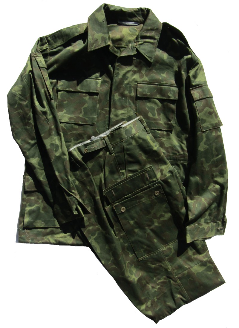 R98D. Russian Army digital camouflage sets. Shirt is zip up with 2 upper pockets, 2 sleeve pockets, mesh armpits. Pants have 2 front slant pockets, 2 cargo pockets, 2 back pockets, button fly. Available in sizes 52-4, 54-4, 56-4, 58-4, 60-4. $99.95
