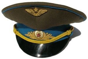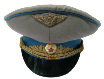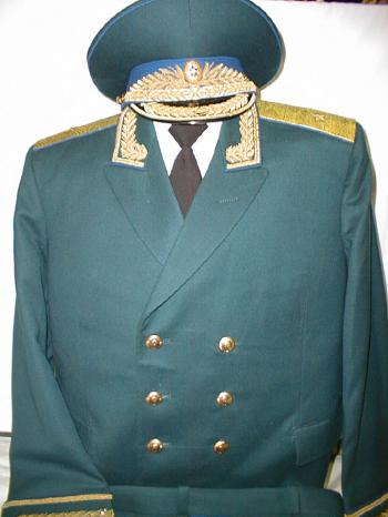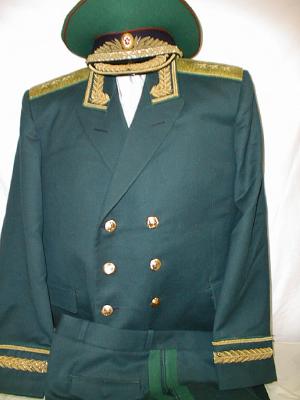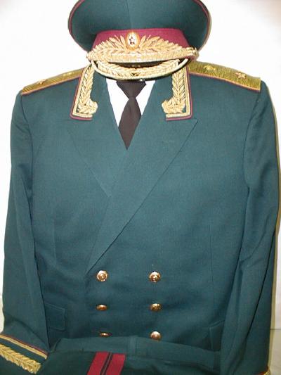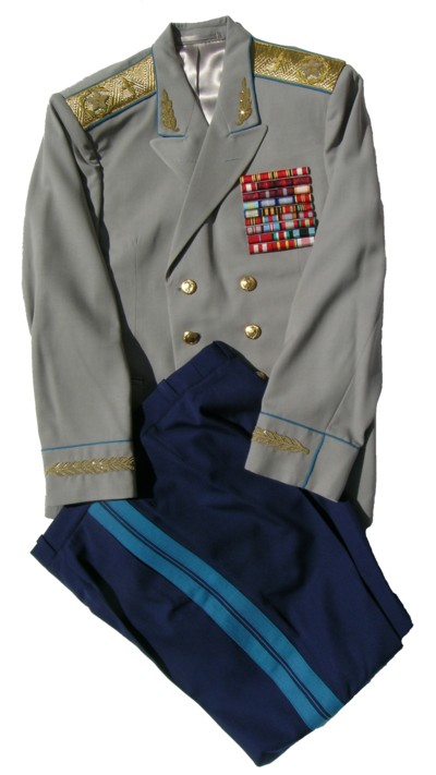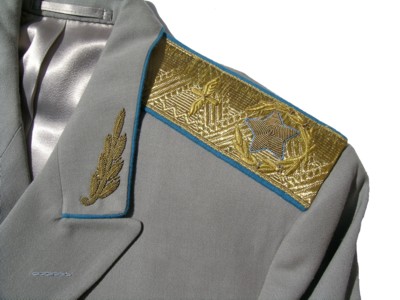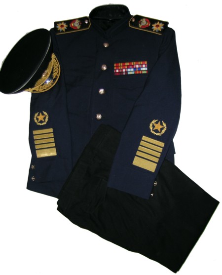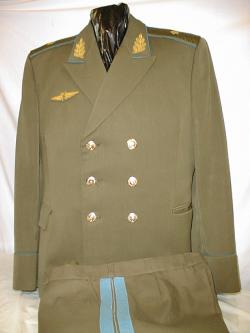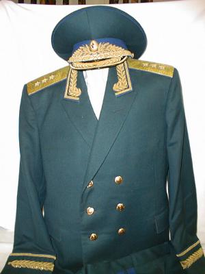 everyday uniform. Complete with jacket,pants,and visor.Jacket has light blue piping and gold embroiderd leaves on collar.Pants have light blue generals stripes.Shoulder boards have embroidered marshal star with gold embroidered wreath and embroidered winged propeller.Size 56-4.$950.00 |