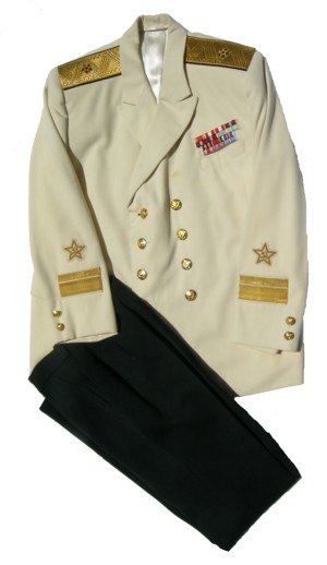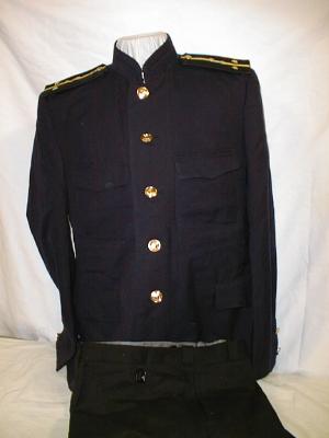 everyday uniform.Jacket, pants,visor.Closed high collar tunic with gold bullion stars on each lower sleeve and Admiral stripes on each sleeve,large ribbon bar.With black pants and visor. |