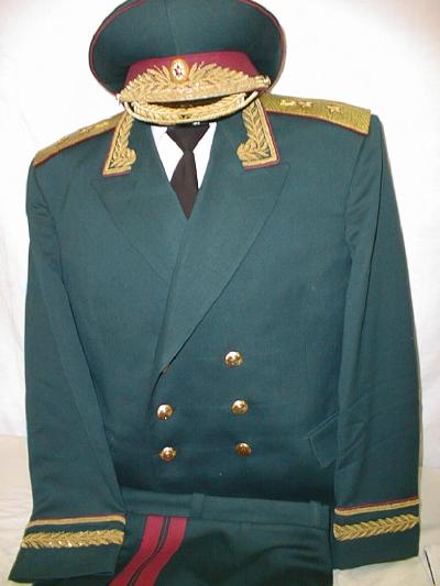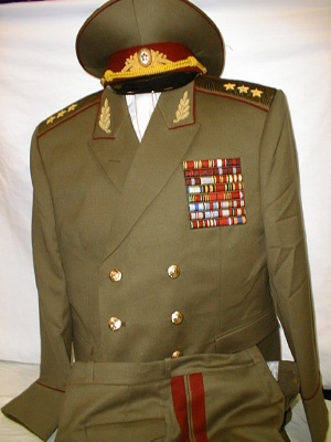 insignia. Shoulder boards have the large embroidered green embroidered Marshal star with embroidered Soviet coat of arms.Breeches are olive with red generals stripes.With visor.ribbon bar.$950.00 |