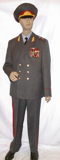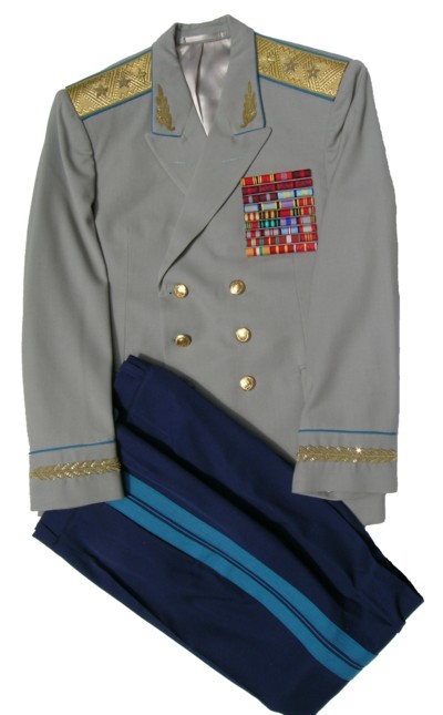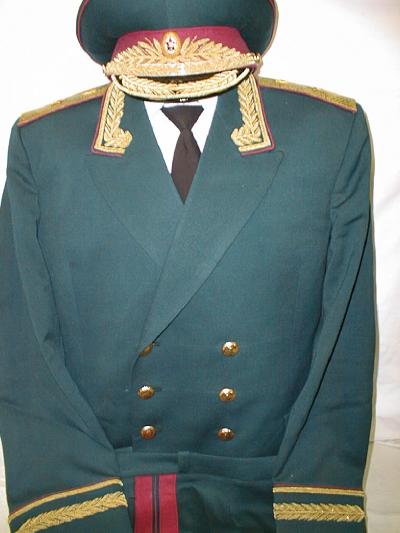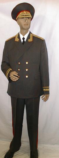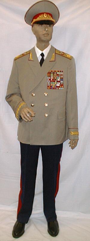 walking out uniform. Jacket,pants,visor.Grey jacket has red piping and gold embroidery on collar and around cuffs,shoulder boards are gold with red underlay and has the large embroidered gold Marshal star with embroidered Soviet coat of arms,large ribbon bar.Pants are dark blue with red generals stripes.Grey visor with red band and red piping with gold embroidery. $1,500 |