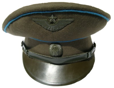 service uniform (jacket, breeches, visor). Jacket is open collar with blue piping around collar and cuffs, subdued plastic buttons, green thread embroidery on collar, large ribbon bar. Shoulder boards are olive wth 1 large embroidered star with blue outline and embroidered winged propeller in green thread. Breeches are olive with blue stripes.General visor is olive color with olive bill and olive chincord, and subdued generals cocarde. About size 58-4. $850.00 |
