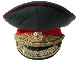 everyday uniform. Jacket,breeches,visor.Jacket has red piping around cuffs and collar, gold embroidered leaves on collar.Large ribbon bar including ribbons for 2 Orders of Lenin.Breeches have red general stripes.Visor has red piping and gold embroidered wreath around Generals kokarde.This rank was used from March 1958 to 1973. About size 58-4.$800.00 |