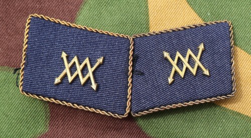 collar tabs.Gold embroidered oak leaves on blue. Unissued pair. $60.00pr |