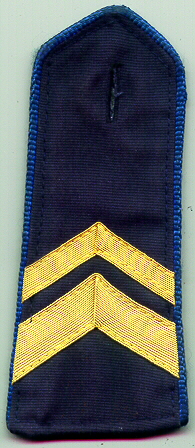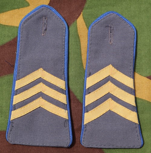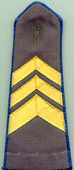 | YU384.Yugoslav police shoulder boards. Sergeant 1st Class. Grey with blue borders and three "V"-shape stripes. Slip on. $25.00 |