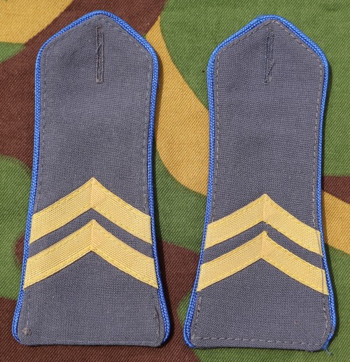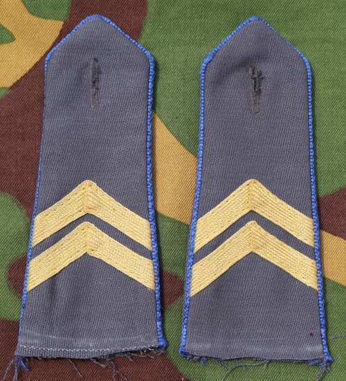 | YU571.Yugoslav police shoulder boards. Sergeant. Grey with blue borders and two "V"-shape stripes. Sew in, removed from tunic. $20.00 |