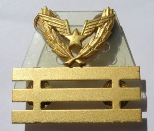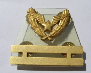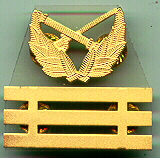 uniform of AIR FORCE LIEUTENANT GENERAL. It consist of two gilded pieces. On is a rank insignia with two rectangular bars, and another is a star with wings within two laurel branches. With two each screws on backside. Fixed on a Plexiglas base. $29.95 |