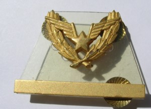 uniform of AIR FORCE COPLONEL GENERAL. It consist of two gilded pieces. On is a rank insignia with three rectangular bars, and another is a star with wings within two laurel branches. With two each screws on backside. Fixed on a Plexiglas base. $34.95 |